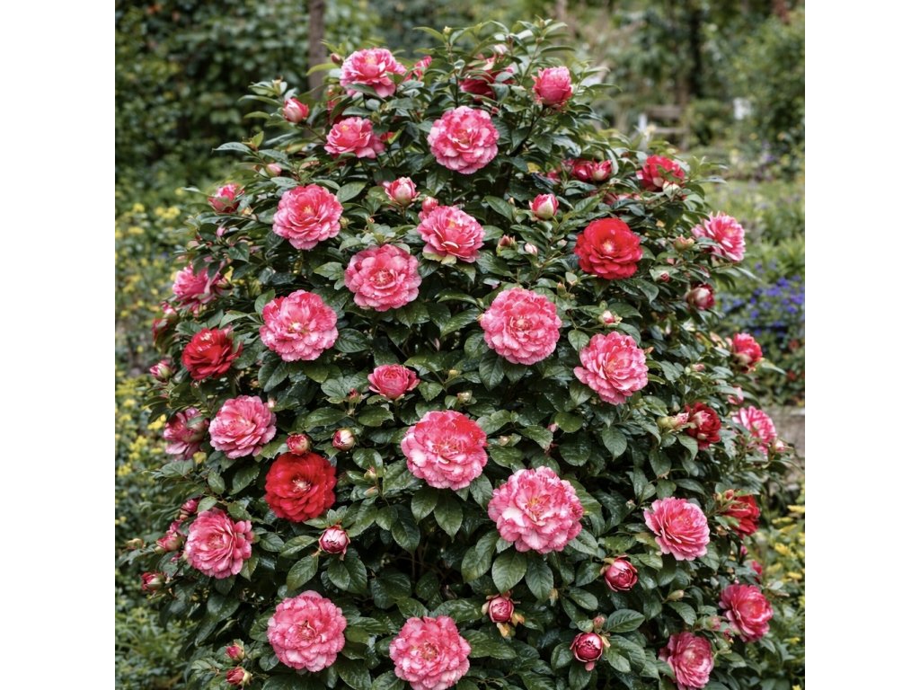 Výrazná japonská kamélie s velkými plnými květy v růžovo-bílé panašované kombinaci, u nichž se přirozeně objevují i čistě červené květy stejného odstínu. Stálezelený keř s lesklými, kožovitými listy, který kvete od konce zimy do jara.