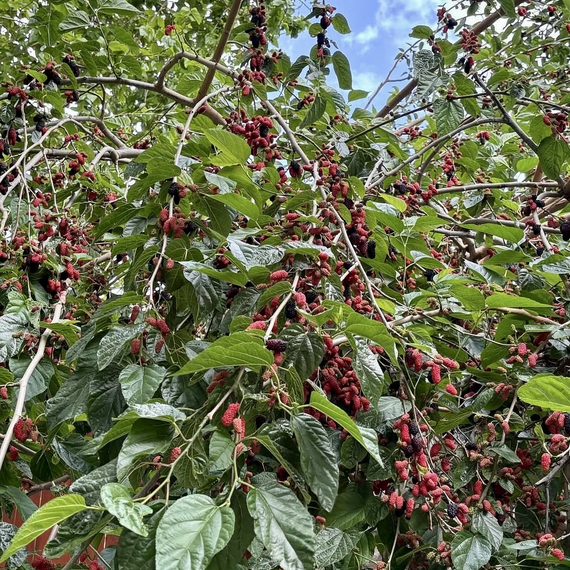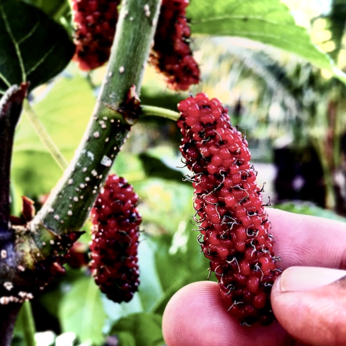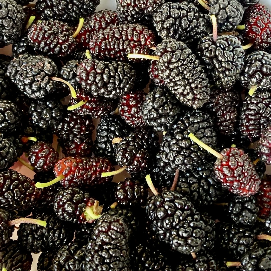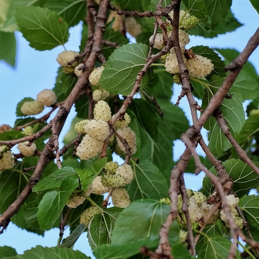 Plody moruše jsou jemné, sladké a při plném dozrání až medové. Šťáva barví prsty do fialova — klasický znak toho, že jste je opravdu jedli čerstvé. Nejsou to plody na skladování a zbytečné kroky od stromu ke košíku je zbavují smyslu. Jsou to plody na zážitek.