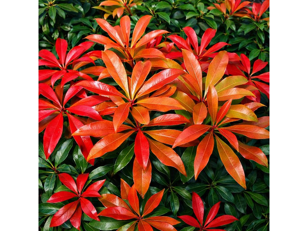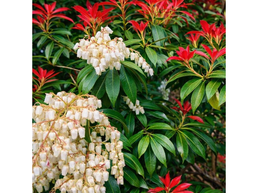 Pieris japonský ‘Mountain Fire’ je osvědčený stálezelený keř s výrazně červeným jarním rašením. Na jaře kvete bohatými bílými květy a po celý rok působí upraveným, elegantním dojmem.