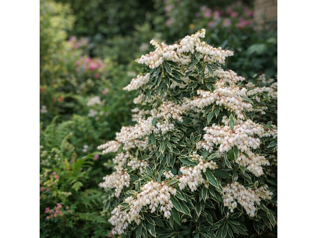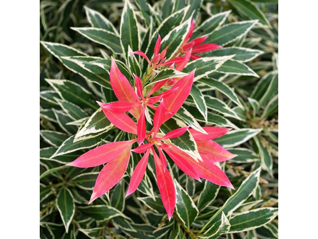 Pieris japonský ‘Variegata’ je stálezelený keř s krémově panašovanými listy a jemnými bílými květy. Největší efekt má při rašení, kdy se objevují narůžovělé až červené mladé výhony. Skvěle se hodí do polostínu.