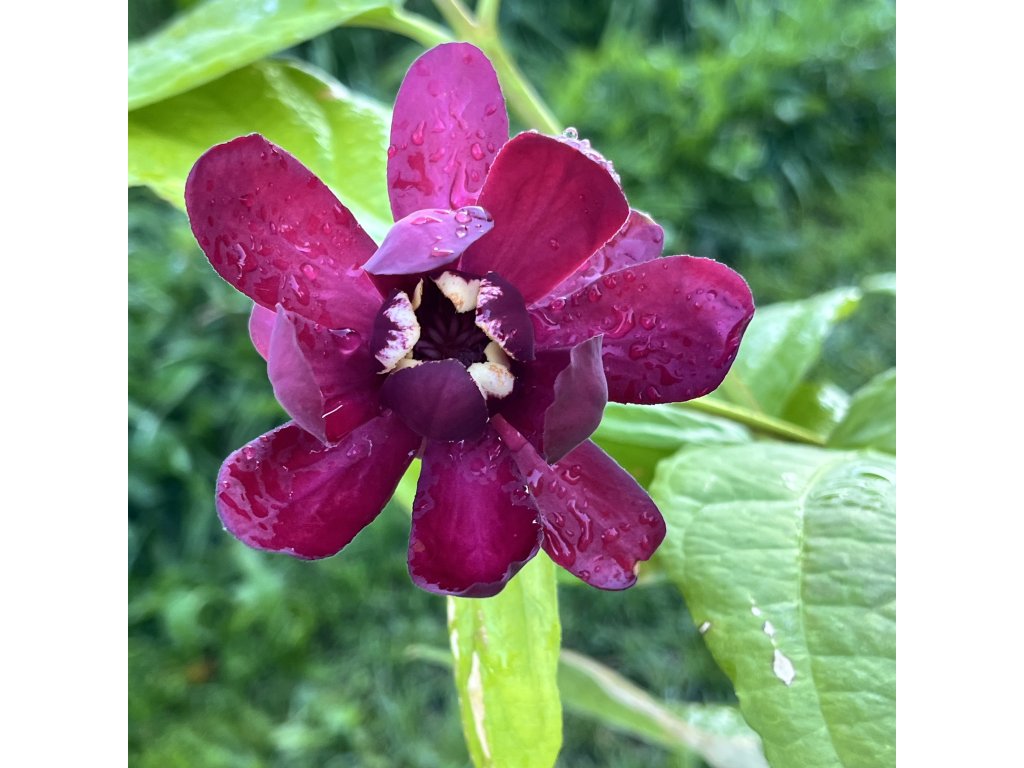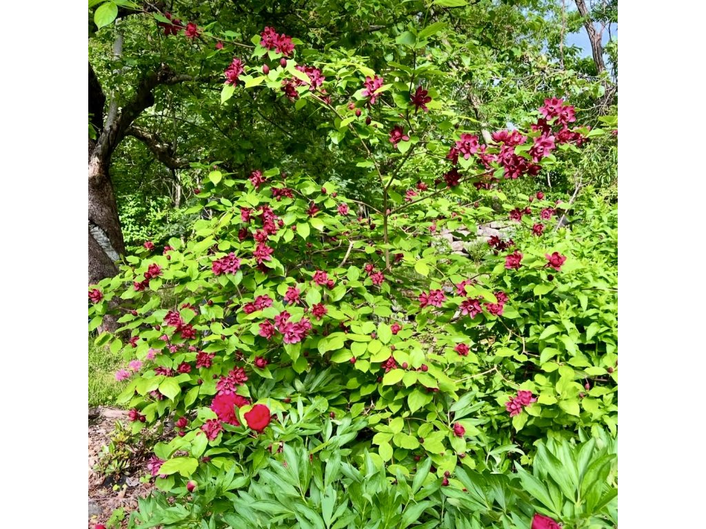 Calycanthus × raulstonii ‘Hartlage Wine’ – kompaktní keř (2–3 m) s velkými sametově vínovými květy a sladce kořeněnou vůní. Kvete od pozdního jara, listy na podzim žloutnou....