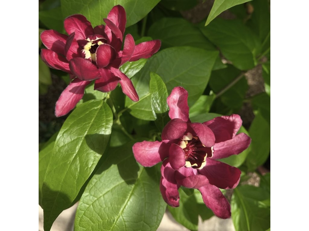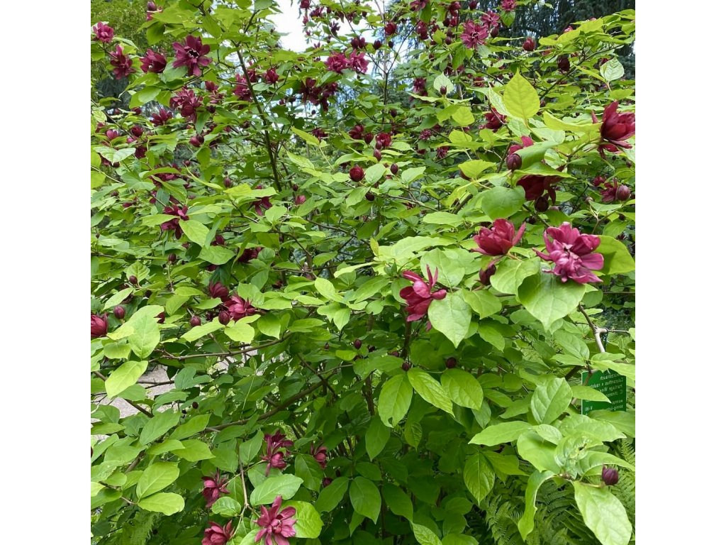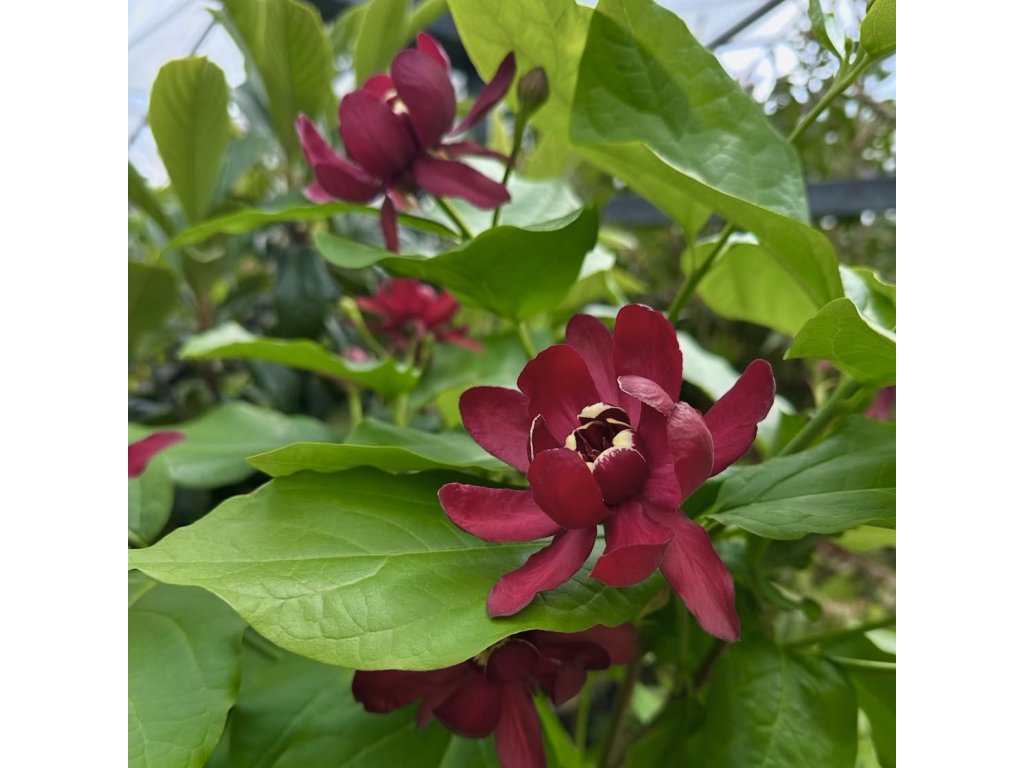 Calycanthus × raulstonii ‘Hartlage Wine’ – kompaktní keř (2–3 m) s velkými sametově vínovými květy a sladce kořeněnou vůní. Kvete od pozdního jara, listy na podzim žloutnou. Nenáročný, mrazuvzdorný, ideální k terase i jako solitéra.