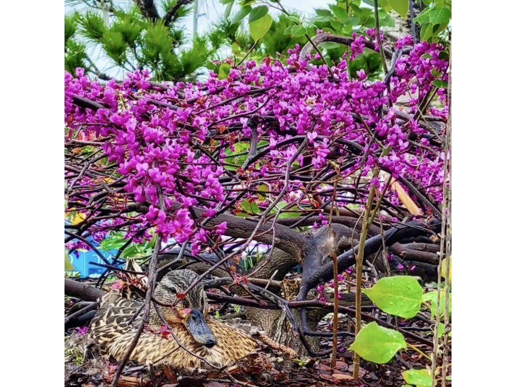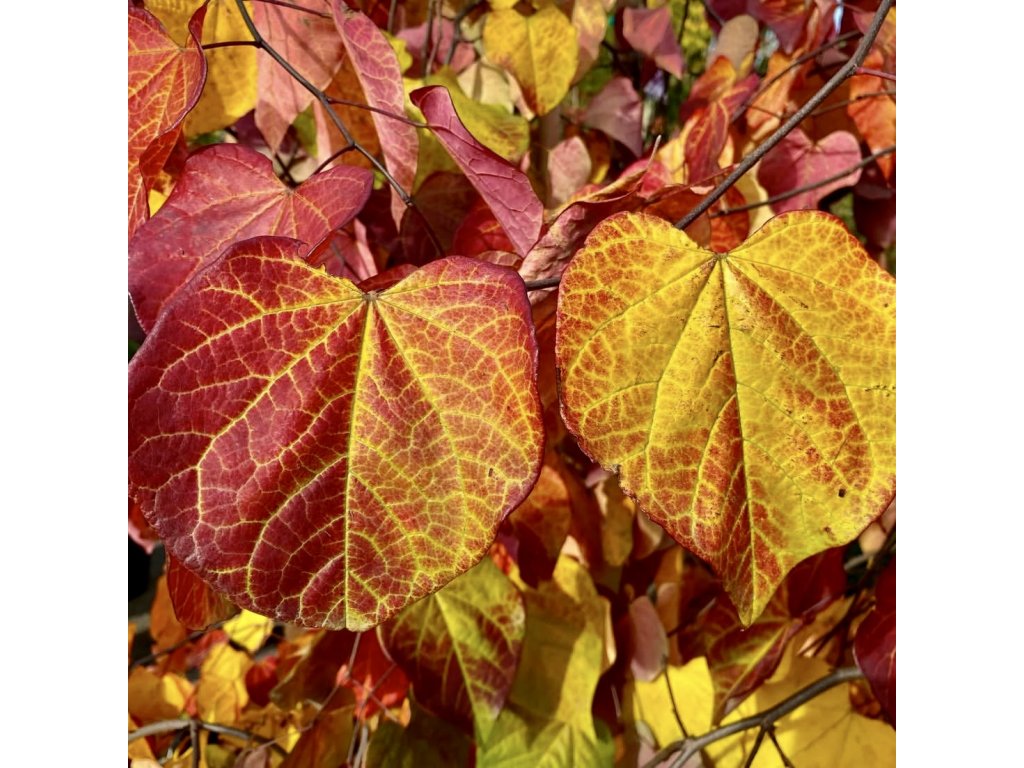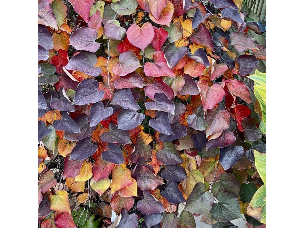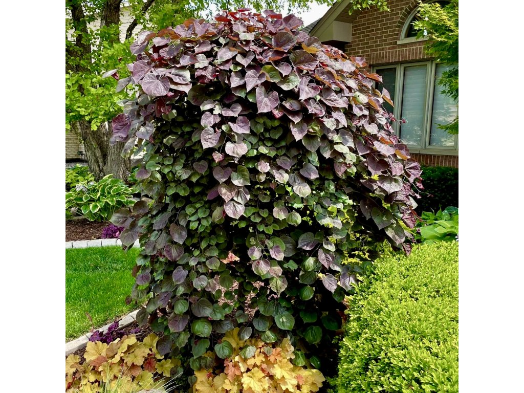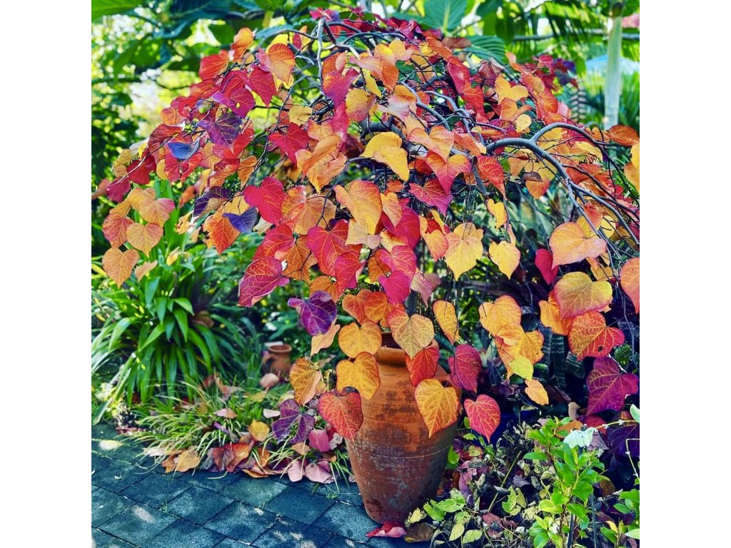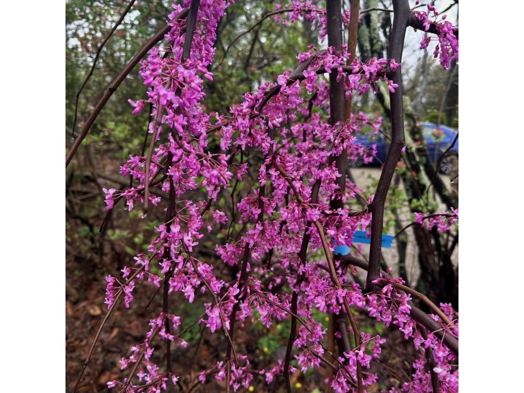 Cercis canadensis ‘Ruby Falls’ – kompaktní převislá zmarlika s jarní záplavou růžově purpurových květů a sytě vínovým listem po celé léto. Květy jsou jedlé, keř dorůstá cca 1,5–2,5 m, vhodný jako solitéra do menších zahrad.